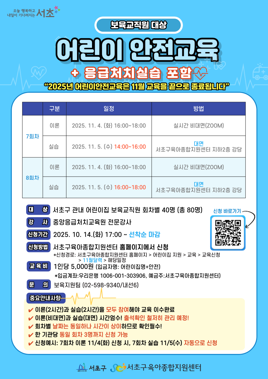 - 교육비 입금 시 ‘교육명/어린이집명/이름’으로 보내주시기 바랍니다(예시: 신입교육/서초/홍길동)