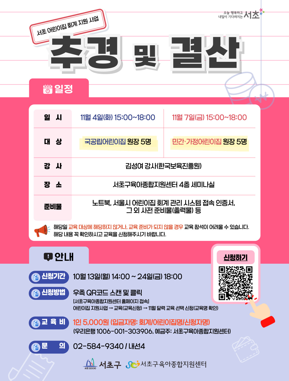 • 계좌번호우리은행 1006-001-303906 (예금주: 서초구육아종합지원센터)