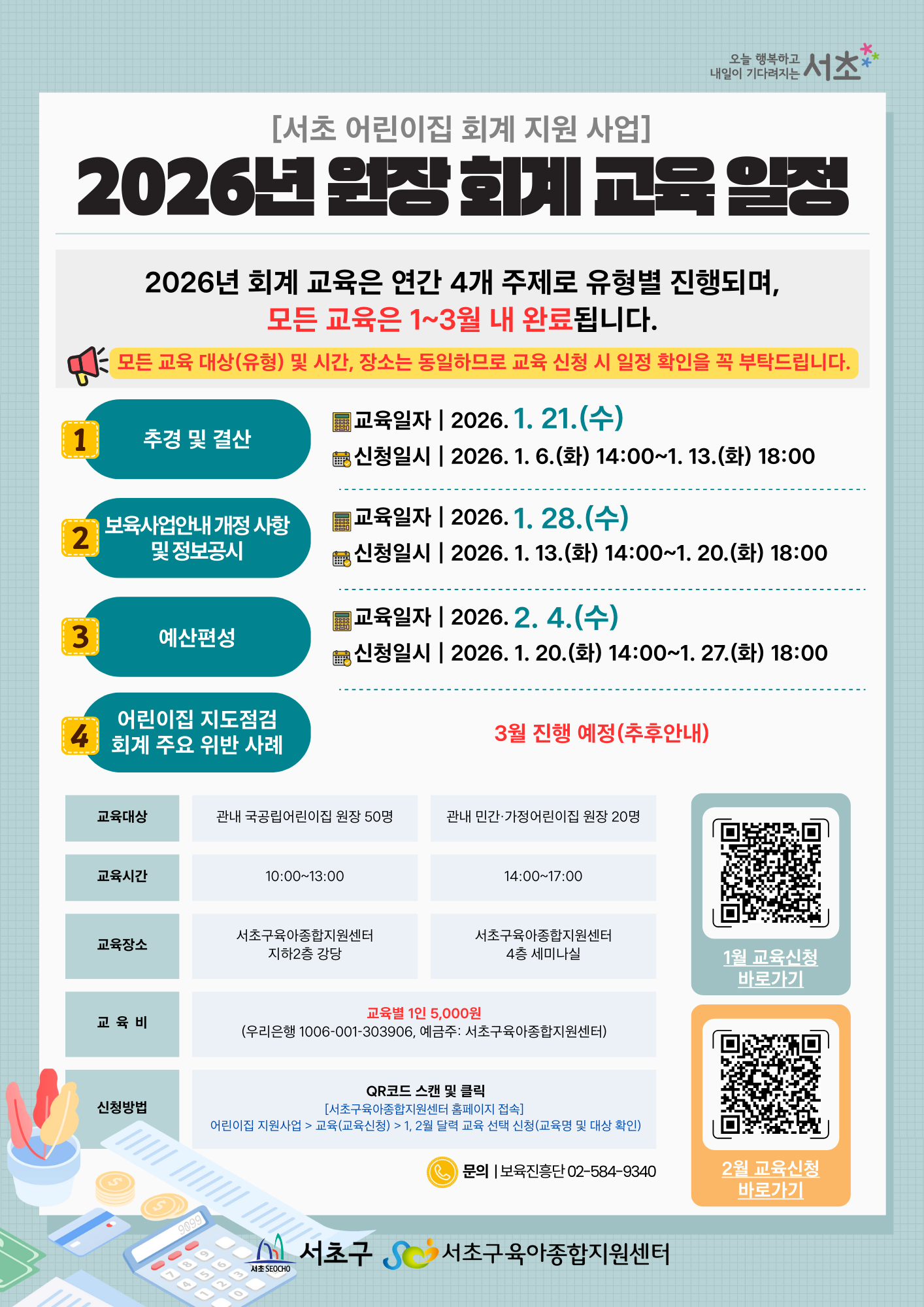 - 교육비 입금 시 ‘교육명/어린이집명/이름’으로 보내주시기 바랍니다(예시: 신입교육/서초/홍길동)