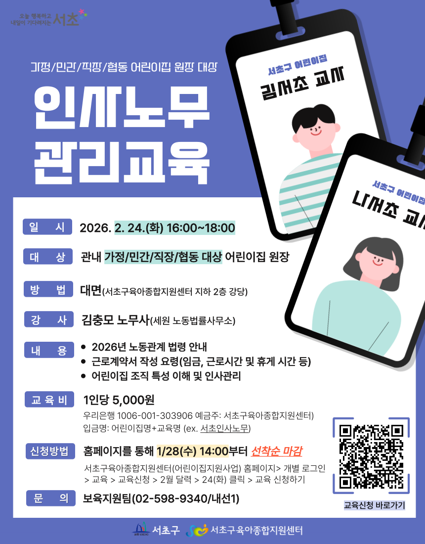 - 교육비 입금 시 ‘교육명/어린이집명/이름’으로 보내주시기 바랍니다(예시: 신입교육/서초/홍길동)