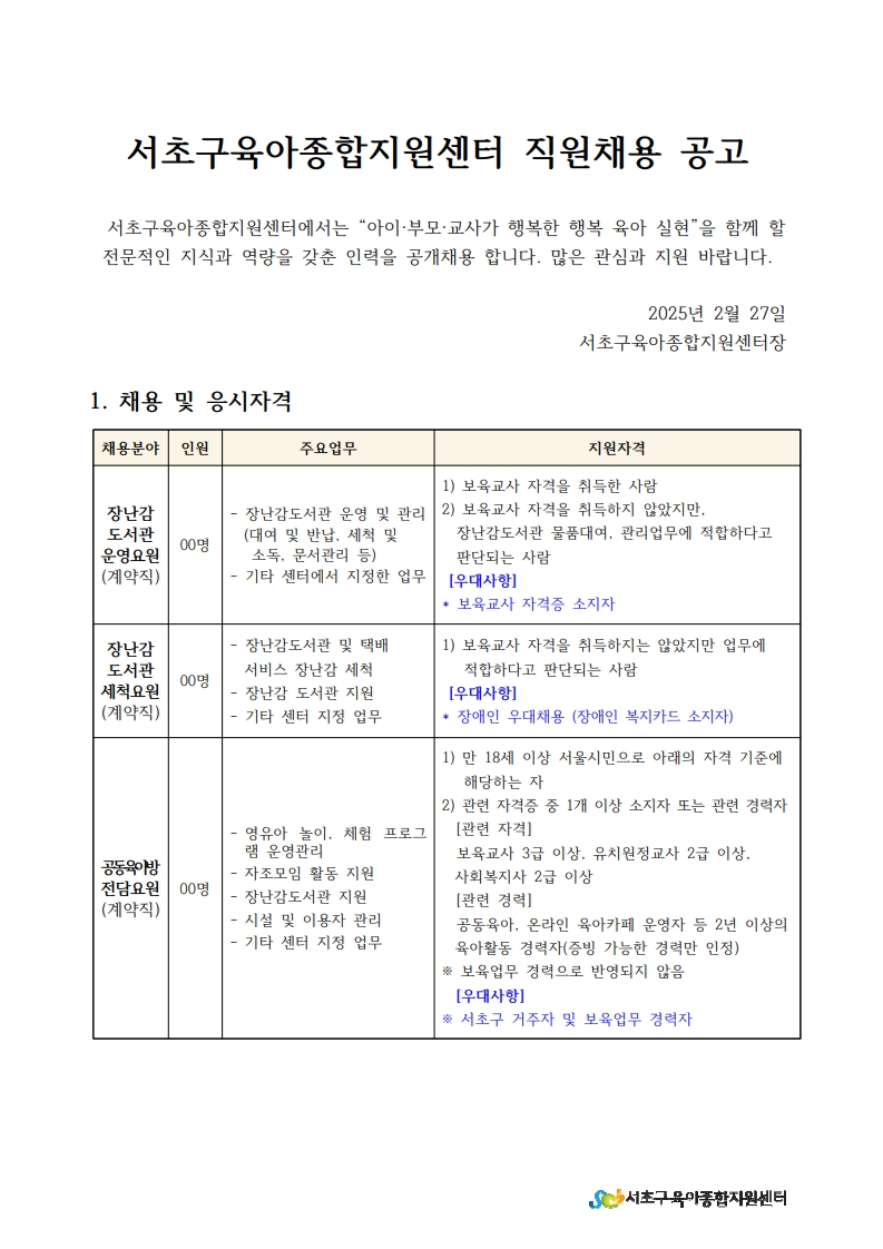 1. 서초구육아종합지원센터 직원채용 공고문(장난감도서관운영요원,세척요원,공동육아방).pdf