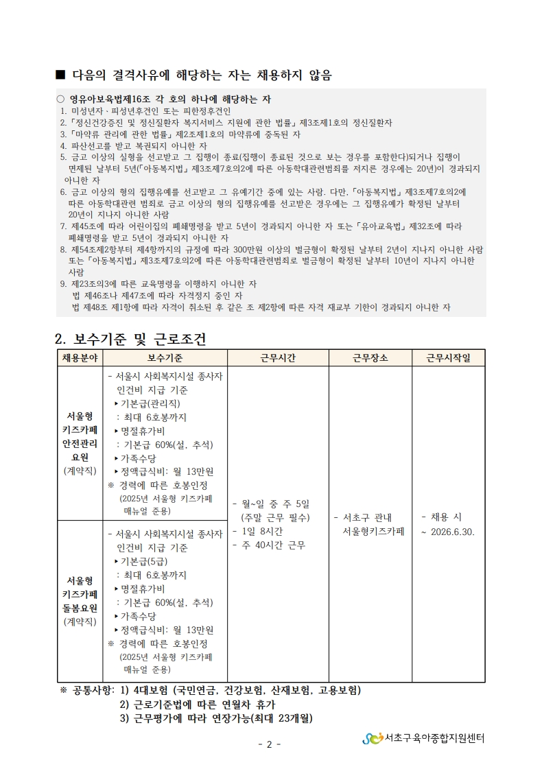 2. 서초구육아종합지원센터 직원채용 공고문(서울형키즈카페-안전관리, 돌봄요원).pdf