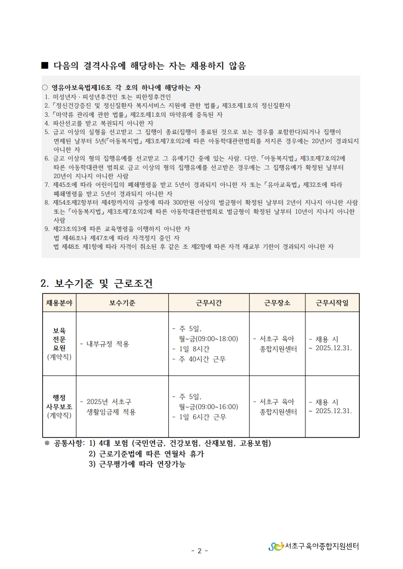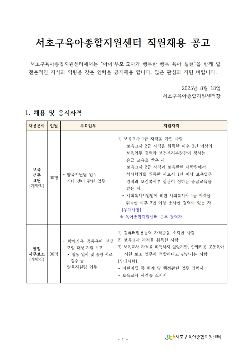 1. 서초구육아종합지원센터 직원채용 공고문(보육전문요원, 행정사무보조).pdf