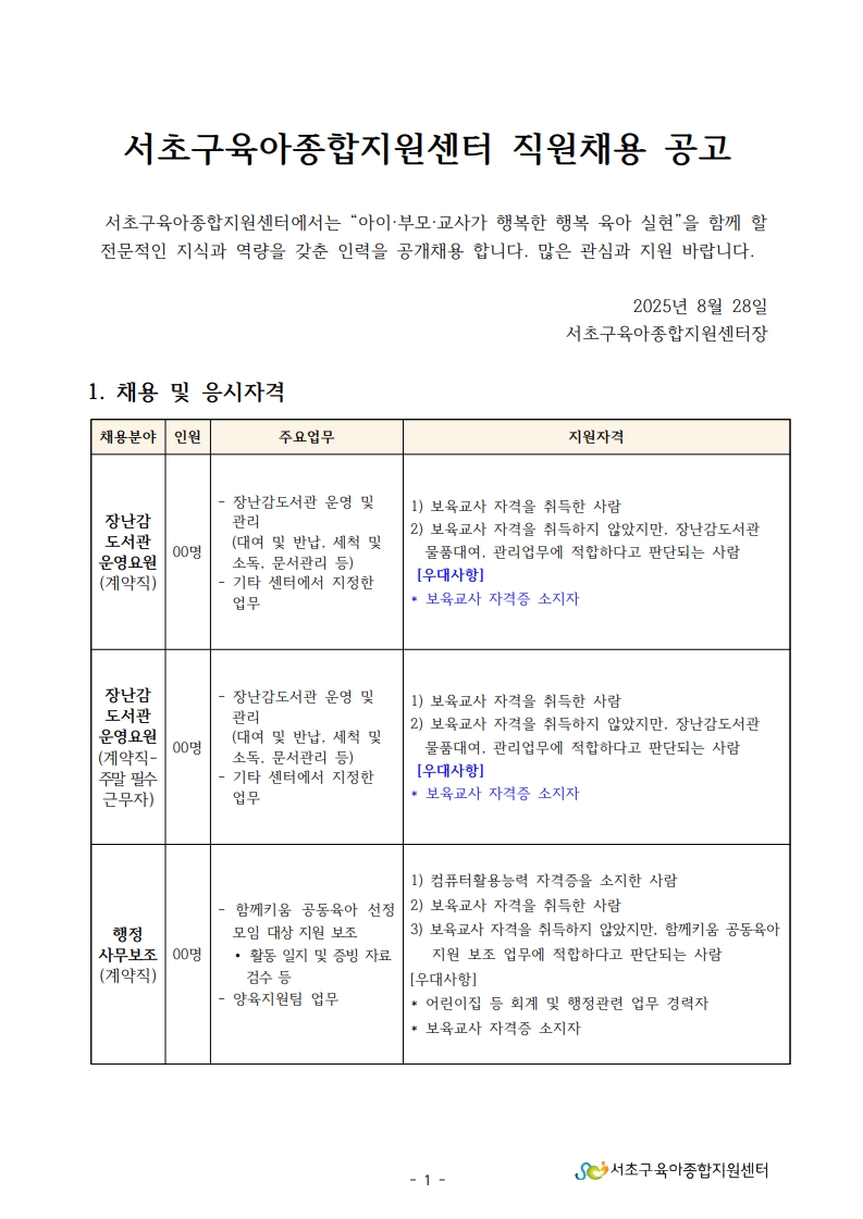 1. 서초구육아종합지원센터 직원채용 공고문(운영요원, 행정사무보조).pdf
