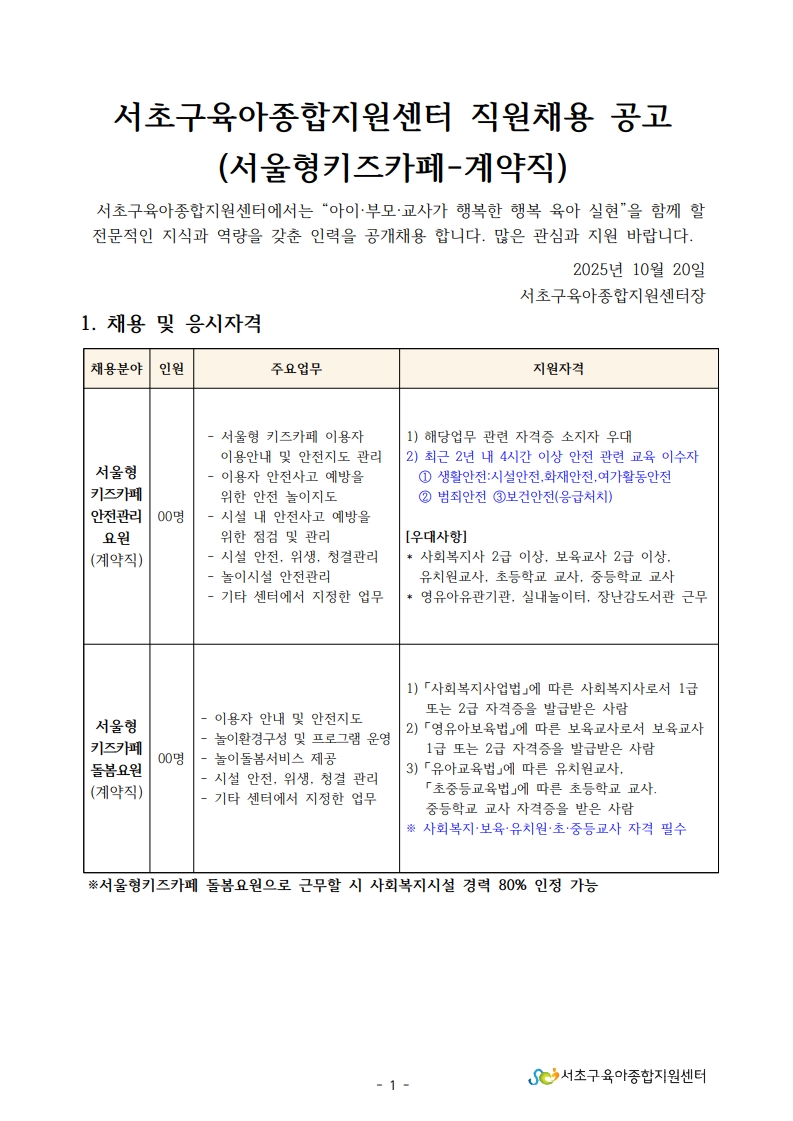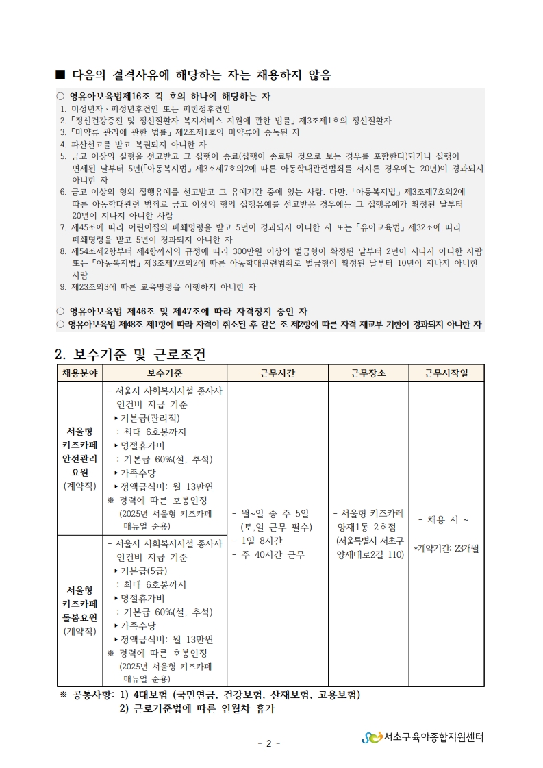 2. 서초구육아종합지원센터 직원채용 공고문(서울형키즈카페-안전관리, 돌봄요원).pdf