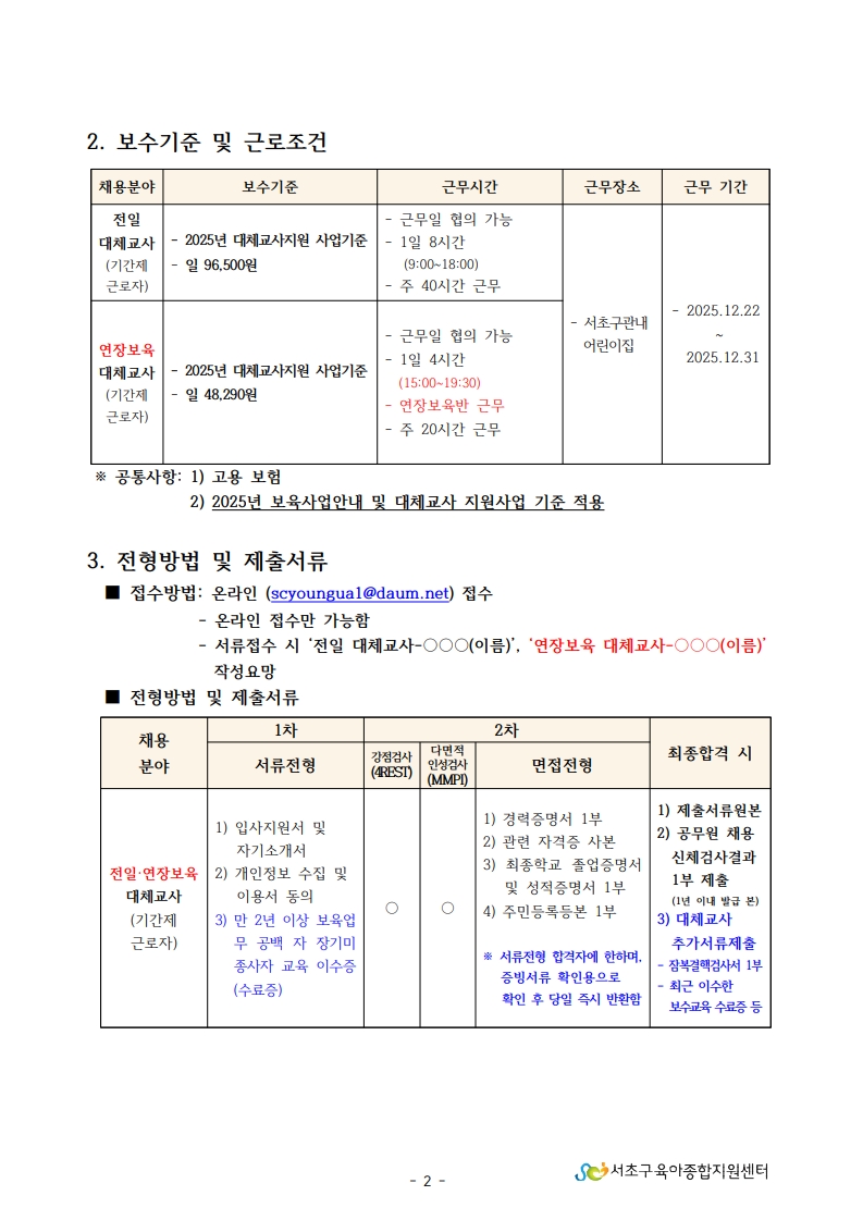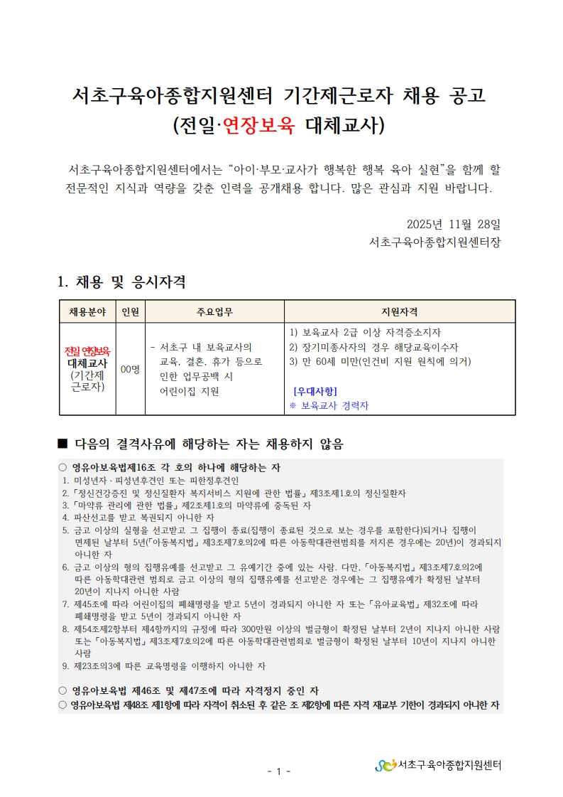 1. 서초구육아종합지원센터 직원채용 공고문(전일, 연장보육 대체교사(기간제근로자)).pdf