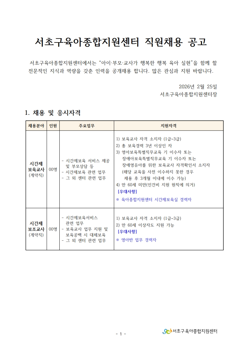 1. 서초구육아종합지원센터 직원채용 공고문(시간제보육교사,시간제보조교사).pdf
