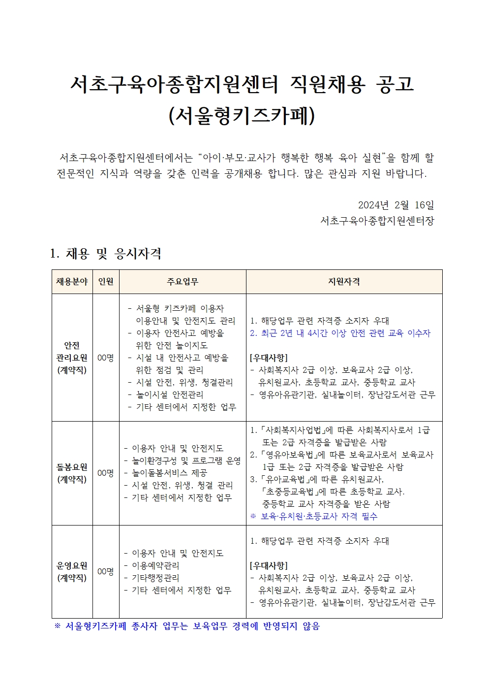 1-2. 서초구육아종합지원센터 직원채용 공고문(서울형키즈카페).hwp
