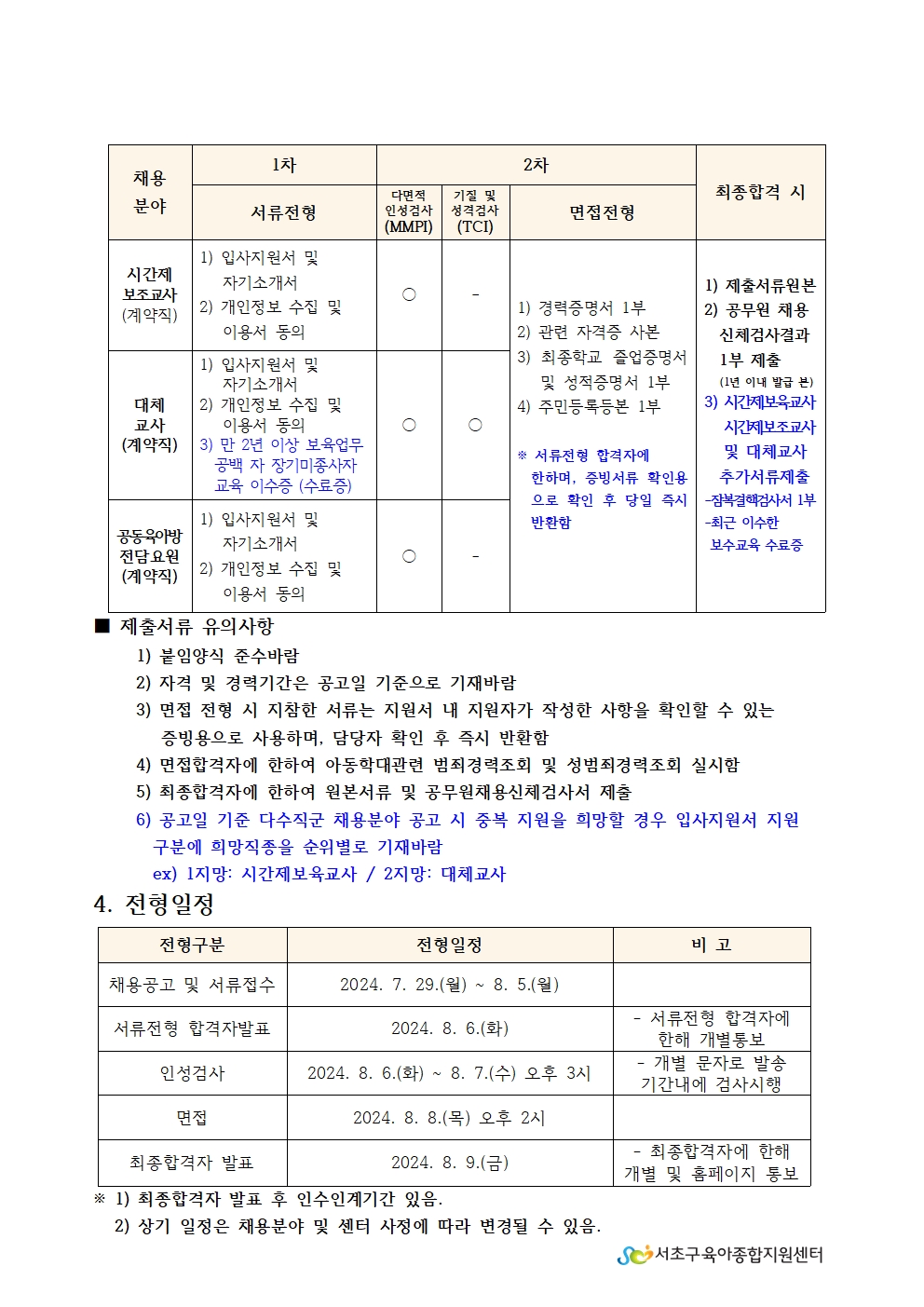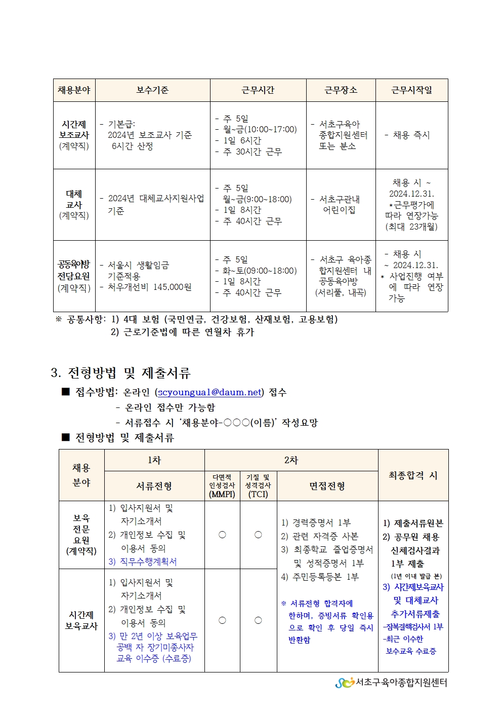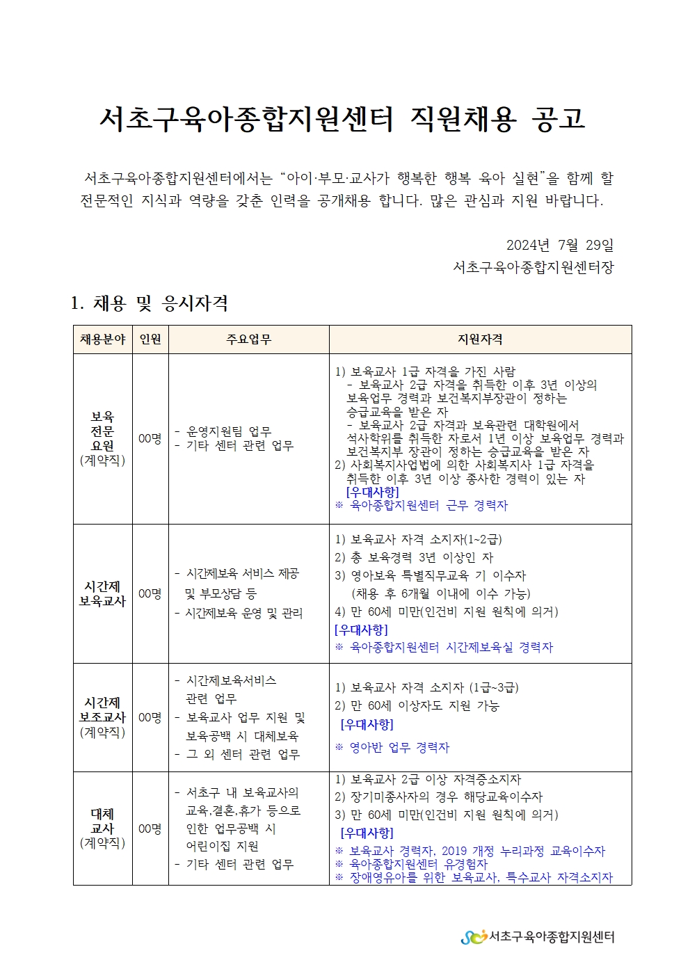 • 1. 서초구육아종합지원센터 직원채용 공고문(보육전문요원,대체교사,시간제보육교사,시간제보조교사,공동육아방).pdf