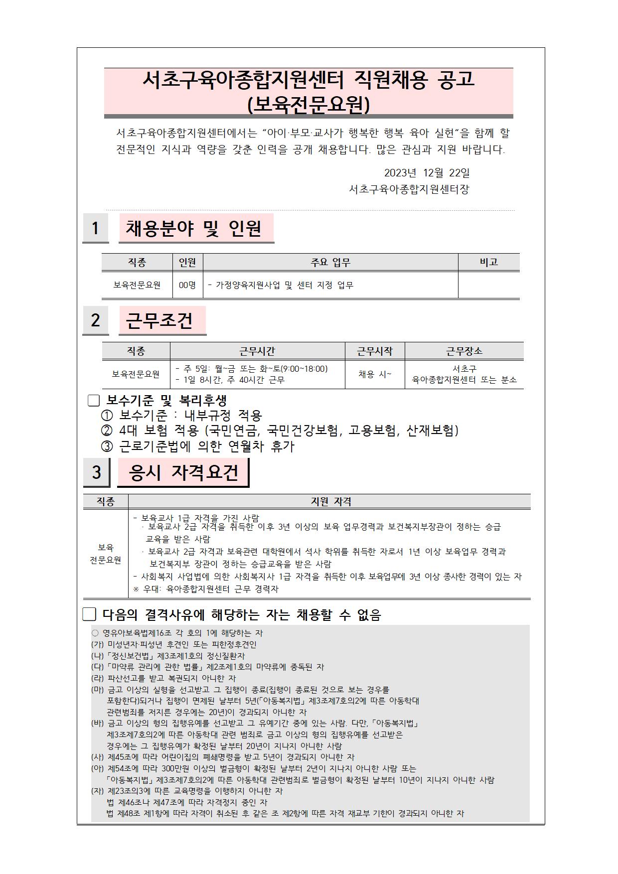 붙임1_1222 서초구육아종합지원센터 직원채용 공고문(보육전문요원).hwp
