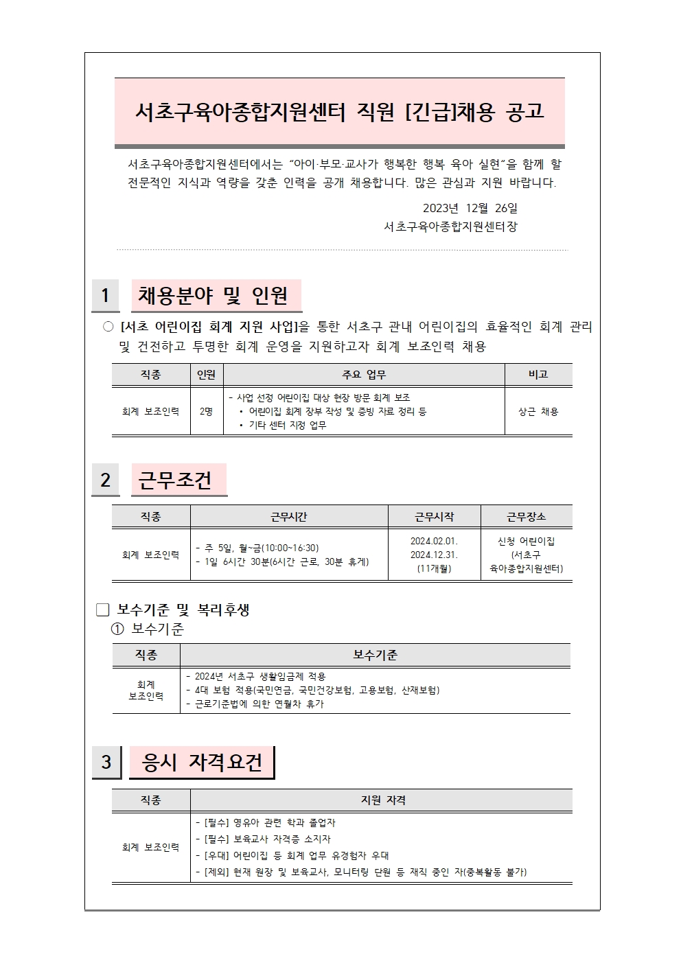 서초구육아종합지원센터 [긴급]직원 채용(회계 보조인력) 공고문.hwp