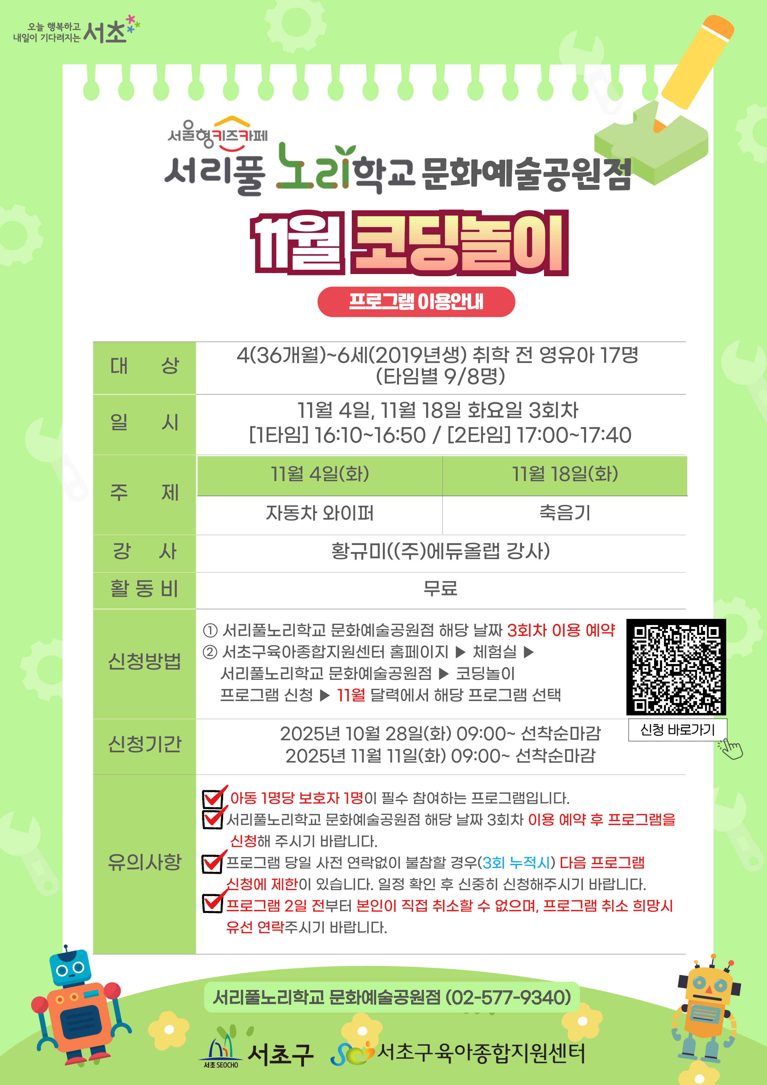 서리풀노리학교 문화예술공원점 11월 코딩놀이 프로그램 안내입니다.