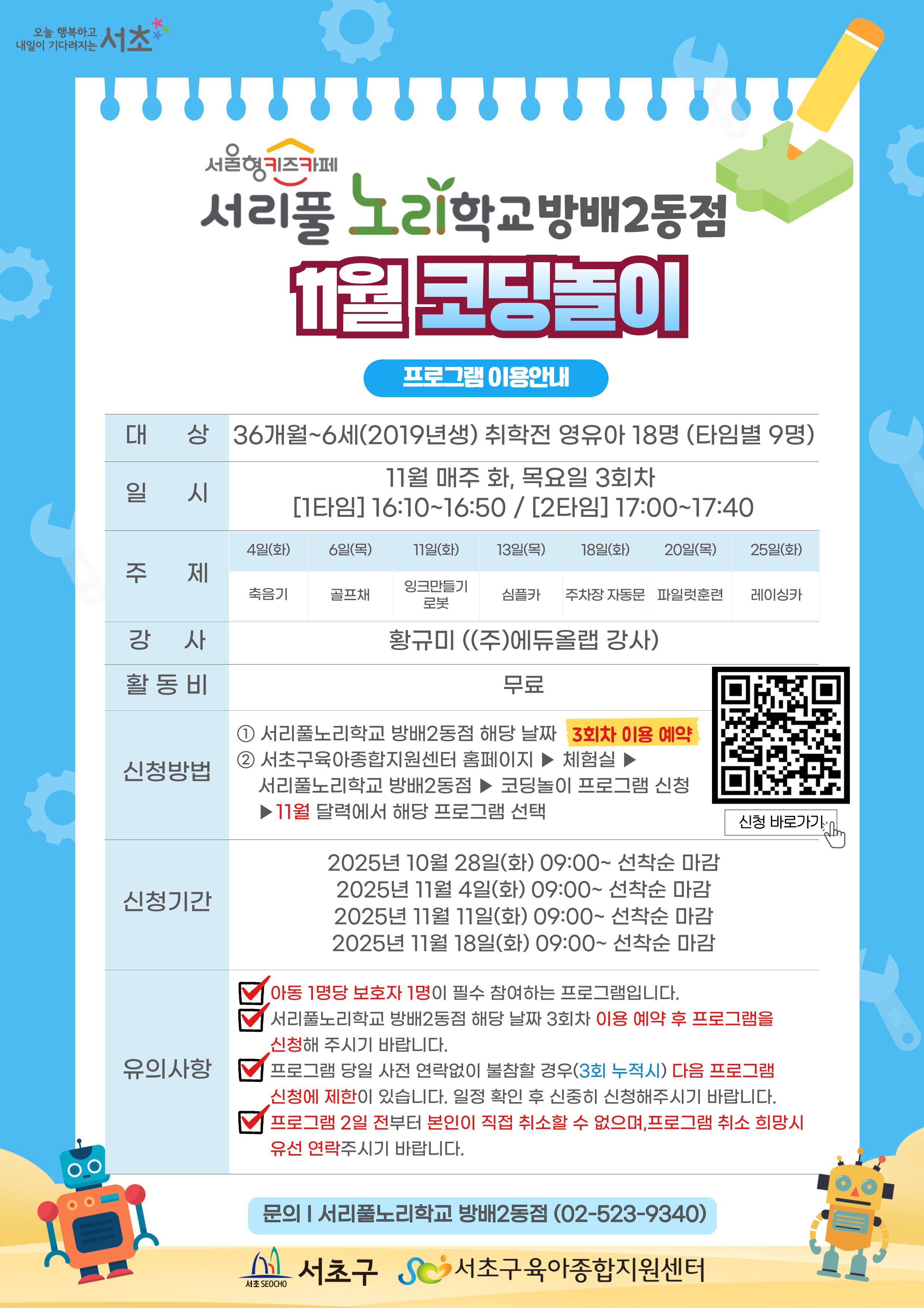 서리풀노리학교 방배2동점 11월 코딩놀이 프로그램 안내입니다.