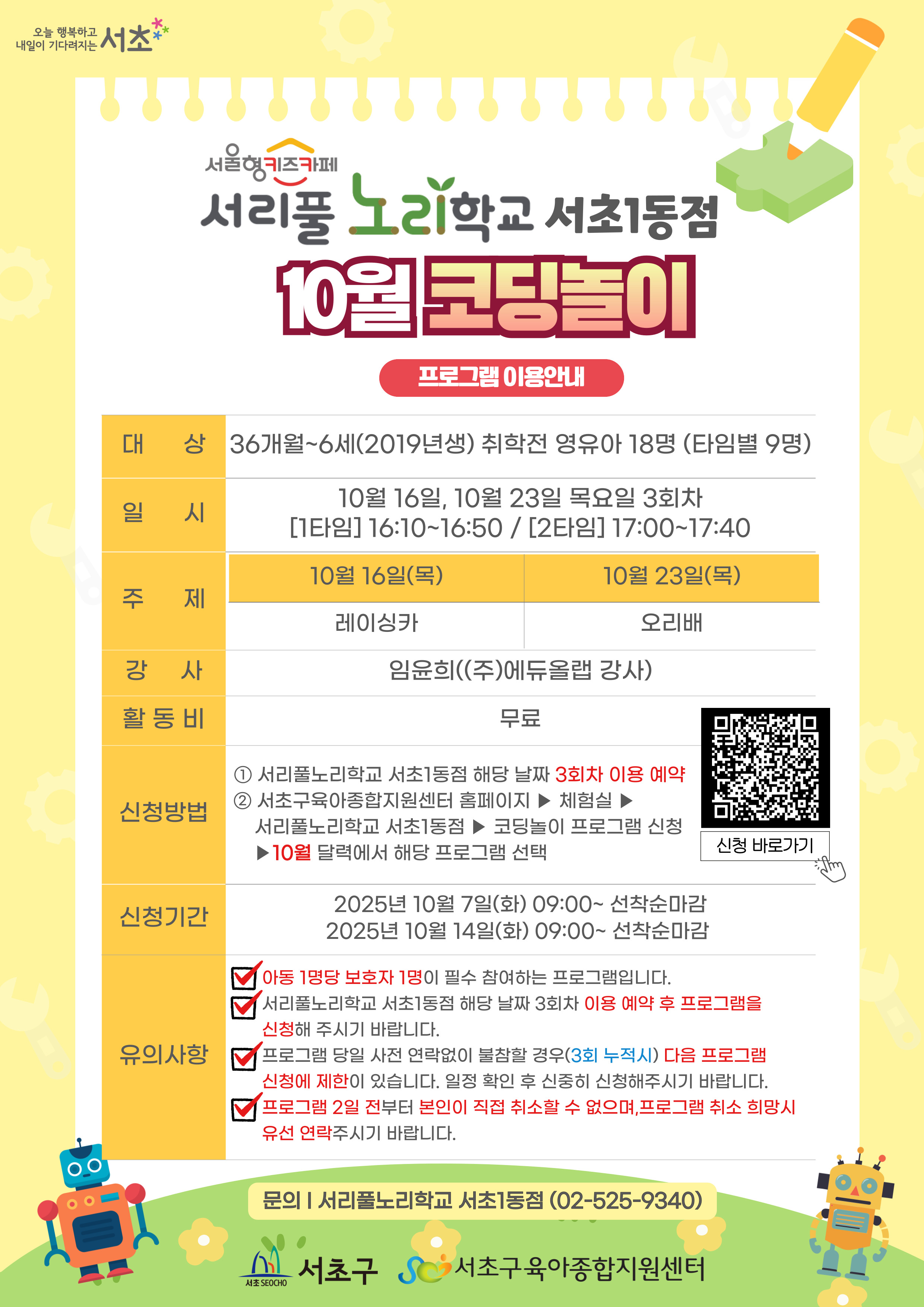 서리풀노리학교 서초1동점 8월 코딩놀이 프로그램 안내입니다.