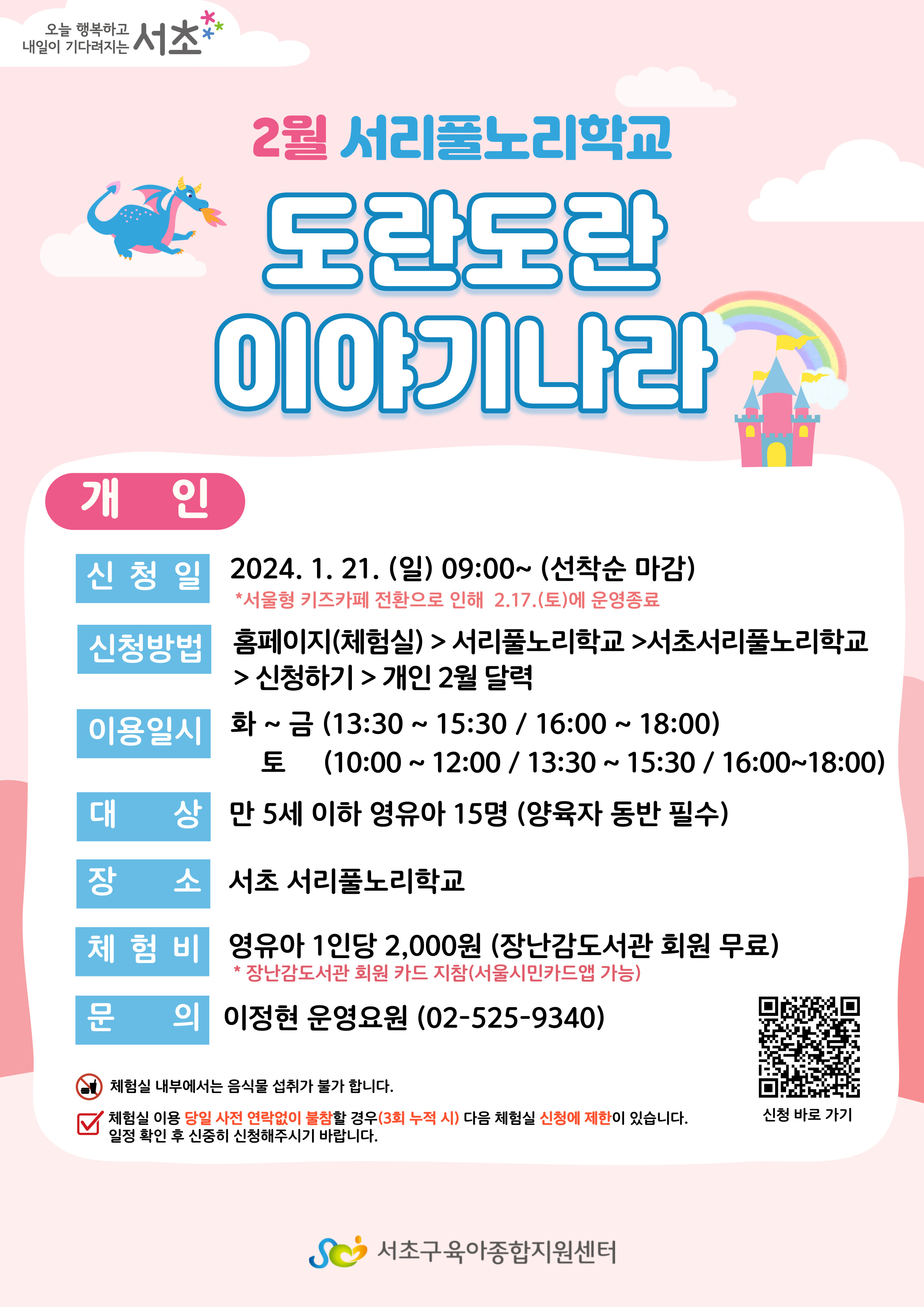 * 서울형 키즈카페 전환으로 인해 서리풀노리학교 운영이 2월 17일에 종료됩니다.