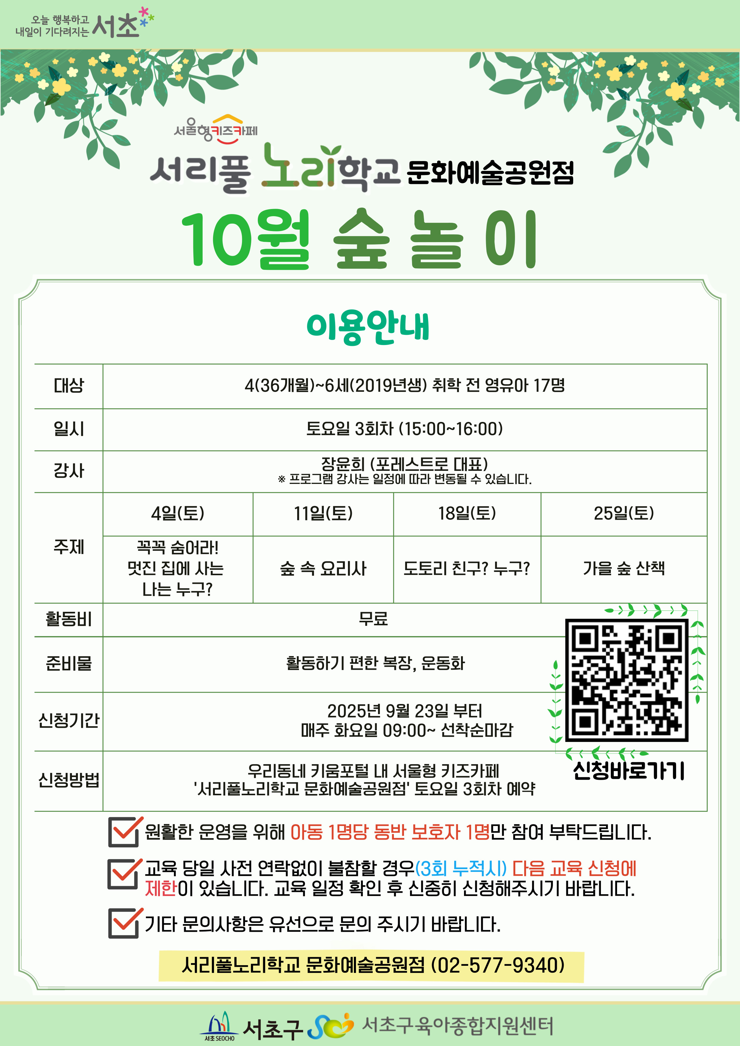 ※ 아래 링크를 누르시면 '우리동네 키움포털 서리풀노리학교 문화예술공원점 홈페이지'로 연결됩니다.