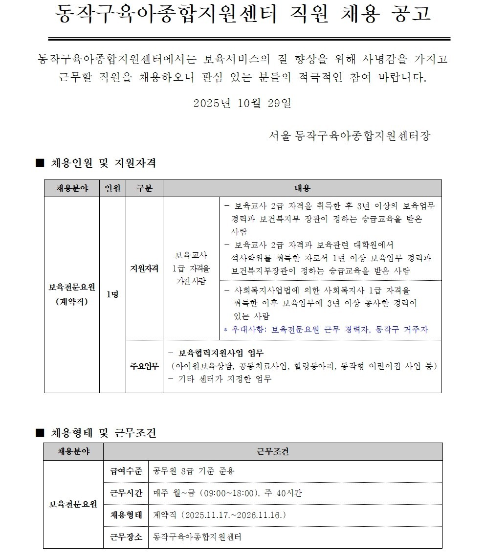 동작구육아종합지원센터 채용 공고배포-보육전문요원.hwp