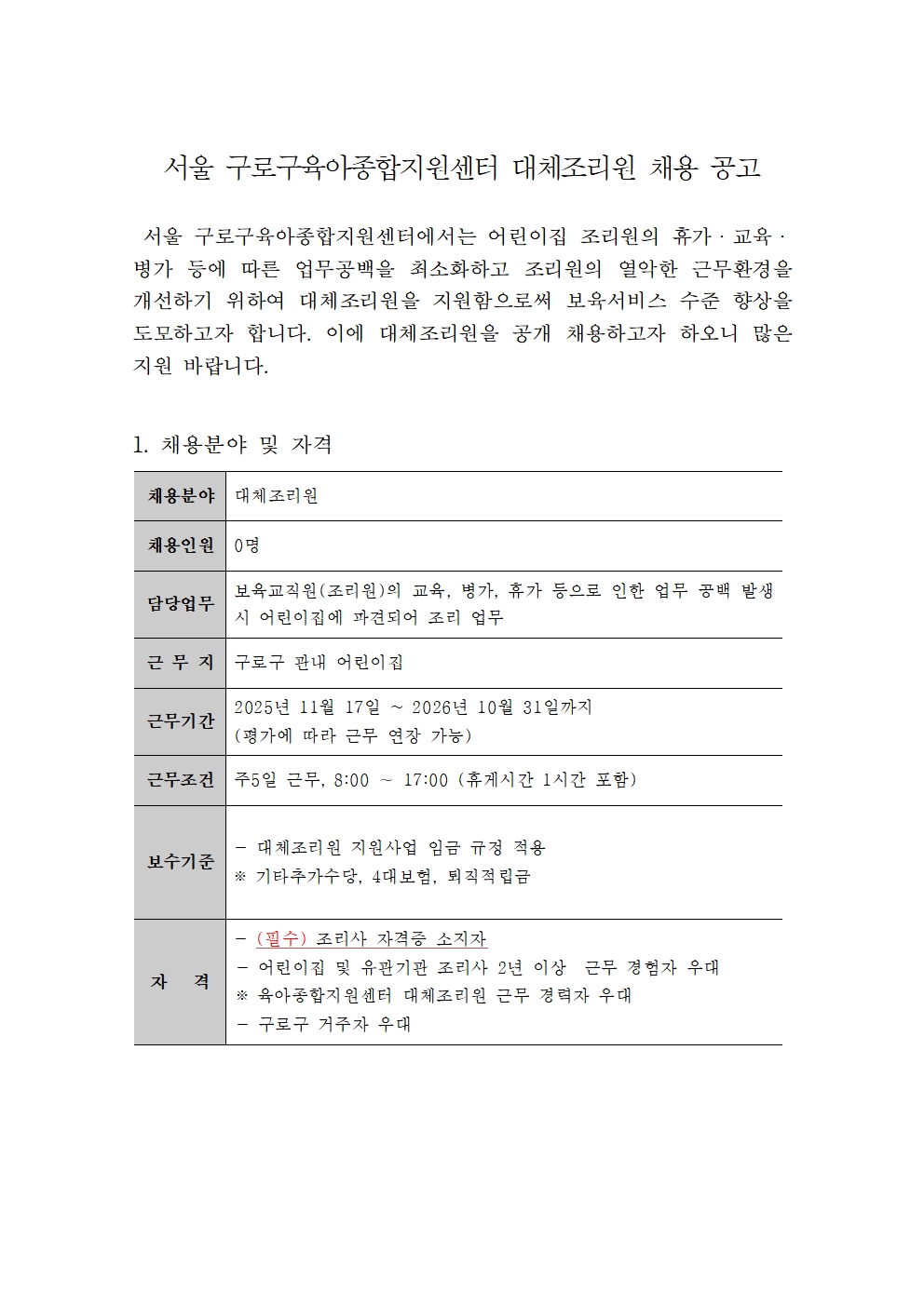 [서울 구로구육아종합지원센터] 대체조리원 채용 공고