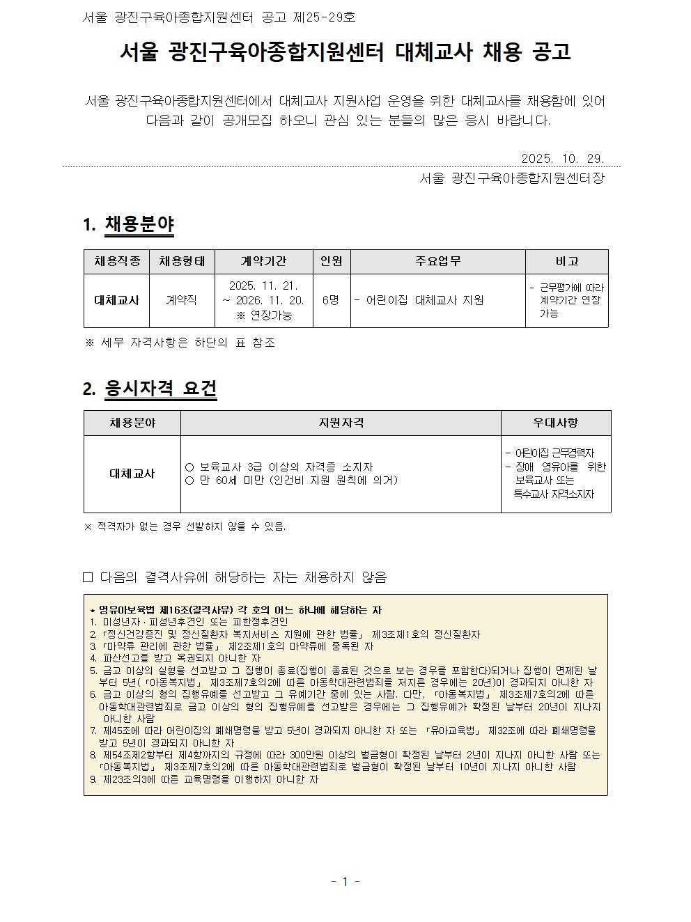 붙임 1. 서울 광진구육아종합지원센터 대체교사 채용공고(제25-29호).hwp