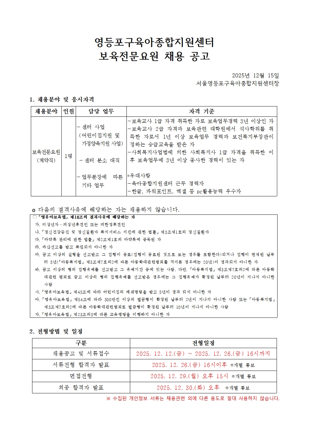 [서울 영등포구육아종합지원센터] 보육전문요원 채용 공고