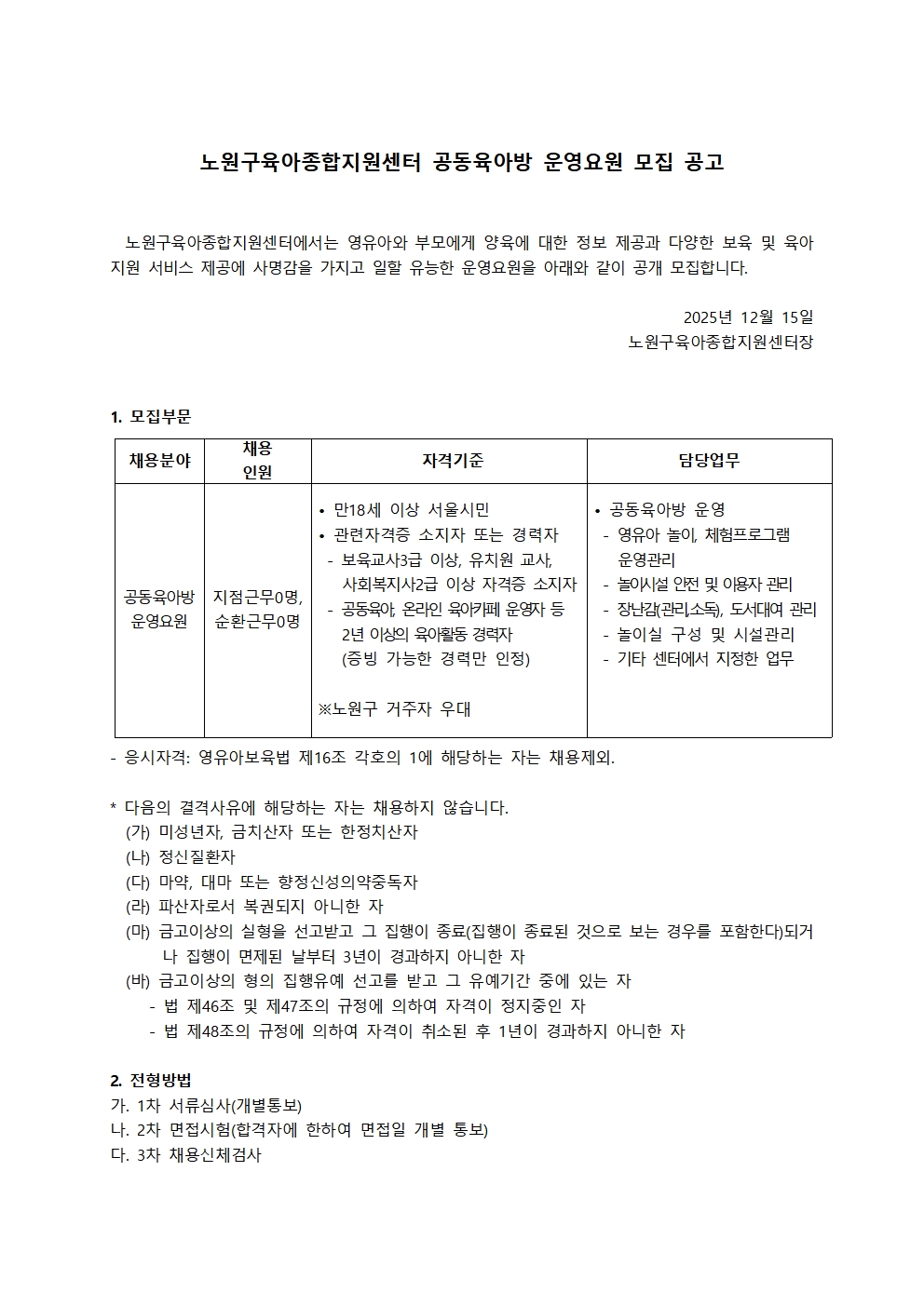 [서울 노원구육아종합지원센터] 공동육아방 운영요원 채용 공고
