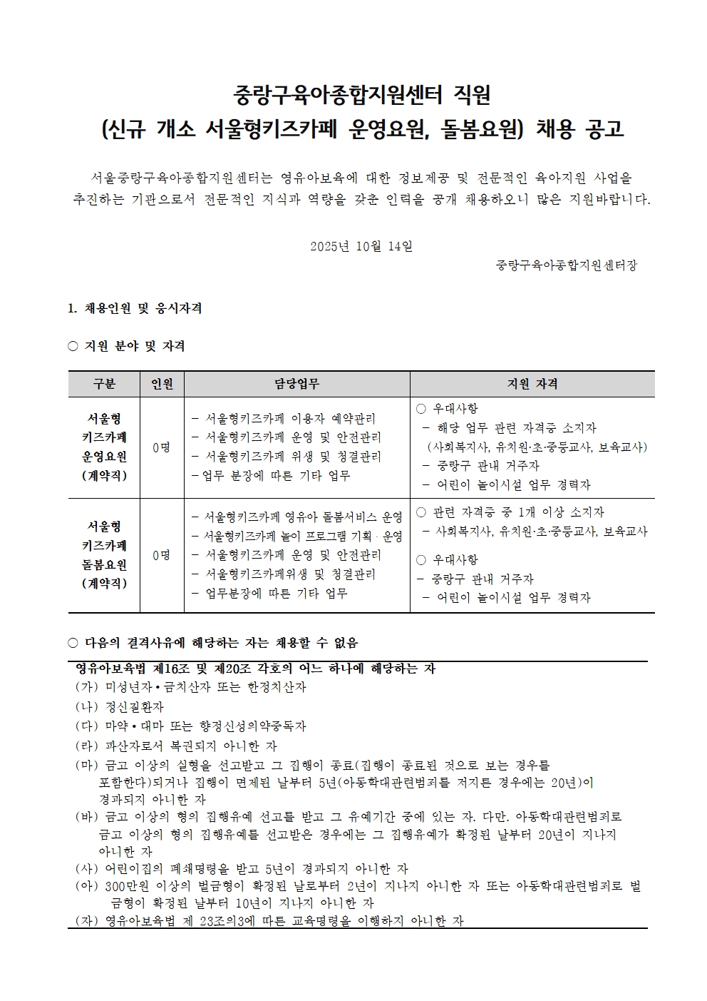 [서울 중랑구육아종합지원센터] 신규 개소 서울형키즈카페 운영요원, 돌봄요원 채용 공고